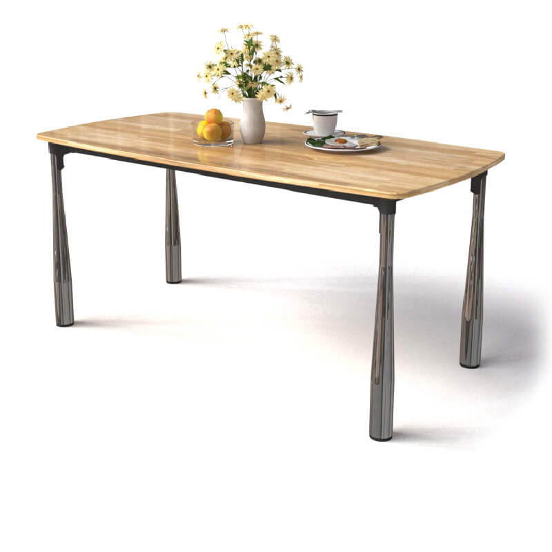 Bàn ăn chân sắt kiểu gậy bóng chày mạ inox màu nòng súng liên kết bằng khớp nhôm hợp kim với khung mặt bàn. Mặt bàn gỗ cao su ghép thanh dày 20mm. Có 2 màu sơn gỗ: nâu cánh gián và vàng tự nhiên. Gỗ cao su có tính đàn hồi, dẻo dai, bền bỉ, không ngậm nước và không thấm nước, dùng lâu vẫn giữ được độ mềm mại, thanh thoát.