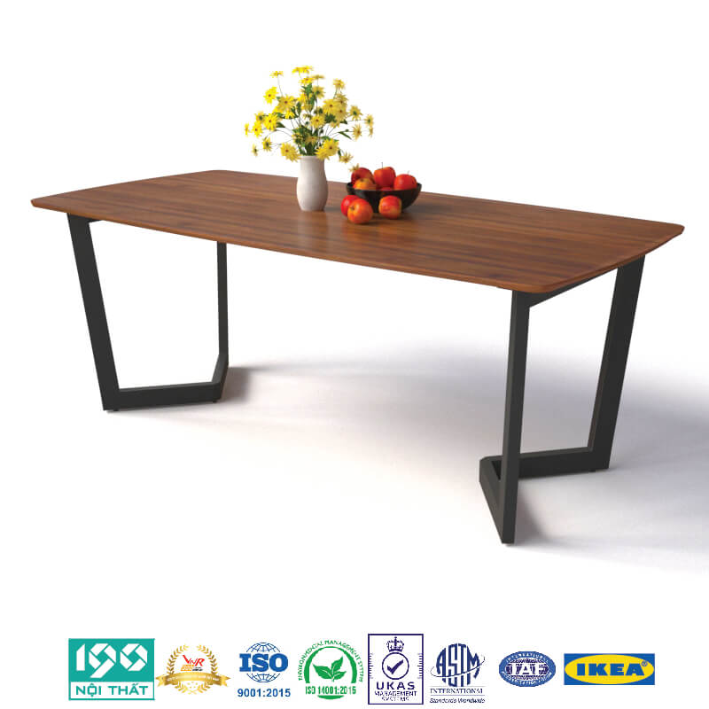 Bàn ăn chân sắt hộp 30x60 tạo hình chân chữ V, sơn đen sần hoặc kem. Mặt bàn gỗ cao su ghép thanh dày 20mm. Có 2 màu sơn gỗ: nâu cánh gián và vàng tự nhiên. Gỗ cao su có tính đàn hồi, dẻo dai, bền bỉ, không ngậm nước và không thấm nước, dùng lâu vẫn giữ được độ mềm mại, thanh thoát.