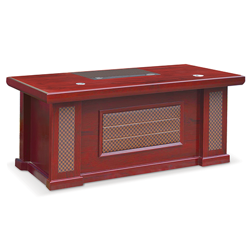 - Bàn giám đốc, mặt bàn chữ nhật, trên mặt bàn mặt yếm, mặt trước chân có ốp PVC ca rô trang trí