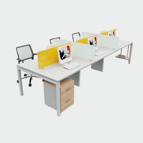 Hệ modul cho 2 người ngồi có vách ngăn bằng kính cường lực hoặc gỗ, hệ chân thép định hình, chắc chắn, thông thoáng, tối đa hóa không gian sử dụng