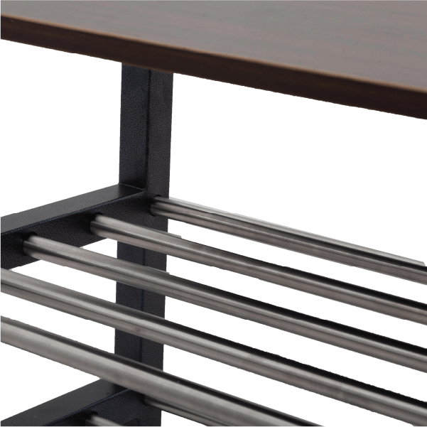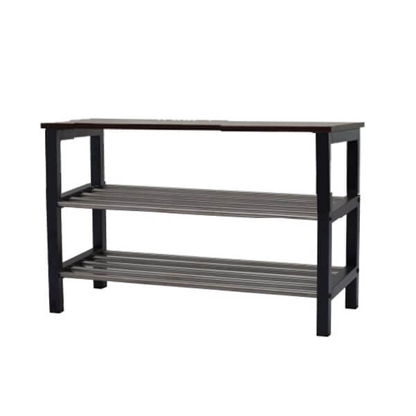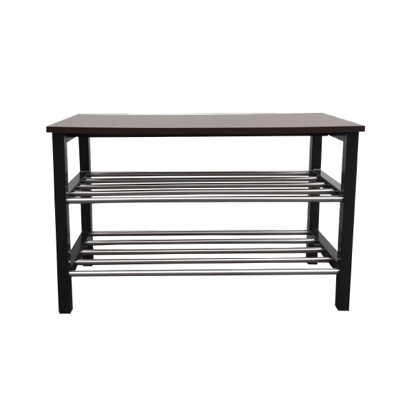 Giá để giày dép 3 tầng đa năng (có mặt ngồi). Sử dụng khung thép sơn sần tĩnh điện KT: 30x30x0.8 mm; giằng bằng inox xước Ø15.9x0.6. Mặt ngồi có giằng ngang khung thép chắc chắn, đặt phía trên là tấm gỗ MFC dày 15mm màu gỗ 338. Sản phẩm phù hợp cho gia đình 2-4 người